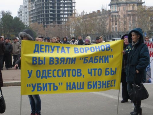 «Феномен» – вон из Николаева", "Прозрачные и равные условия для всех", "Терминалы протащу, малой бизнес затопчу!", "Депутат Воронов, Вы взяли «бабки» у одесситов, чтобы «убить» наш бизнес", "Дробот не надо нас «лечить». – Верни сам деньги в бюджет за «Сердце города», "Депутаты, не продавайте нас киевскому «Феномену»;