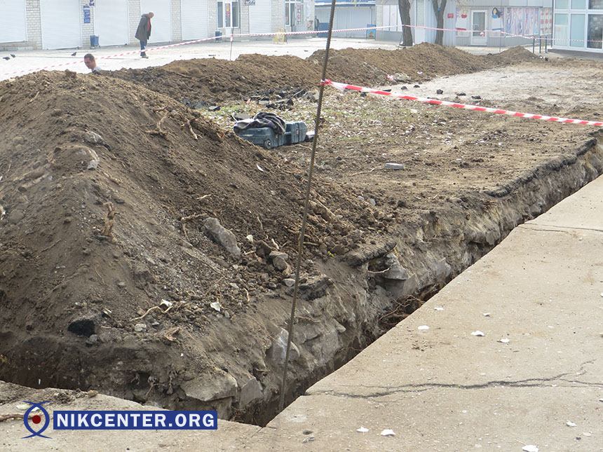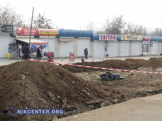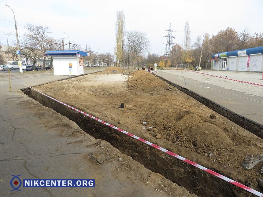 В Николаеве вдоль проспекта Октябрьского, возле зоопарка, ведутся земляные работы. Рабочие утверждают, что строят то ли торговый павильон, то ли пиццерию. Работы ведутся прямо на тротуаре, поэтому вызывают сомнения в «легальности».