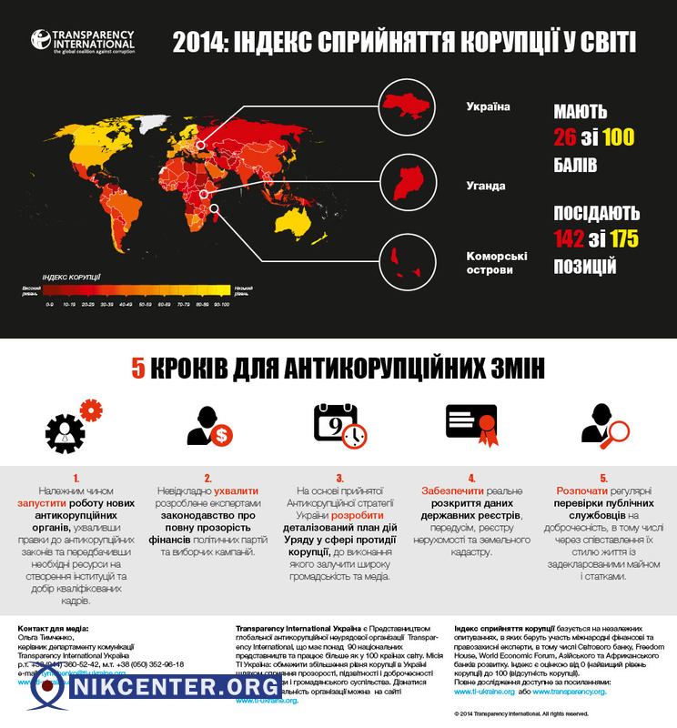 "26 баллов из 100 возможных и 142 место из 175 позиций — такие показатели Украины в нынешнем Индексе восприятия коррупции (Corruption Perceptions Index) от Transparency International. Украина в очередной раз оказалась на одной ступени с Угандой и Коморскими островами как одна из самых коррумпированных стран мира", — говорится в сообщении организации.