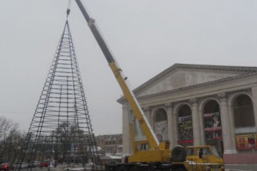 Продолжается установка новогодней елки на площади Героев Сталинграда. Завершаются работы по установке каркаса, потом конструкция будет заполняться искусственными елками.