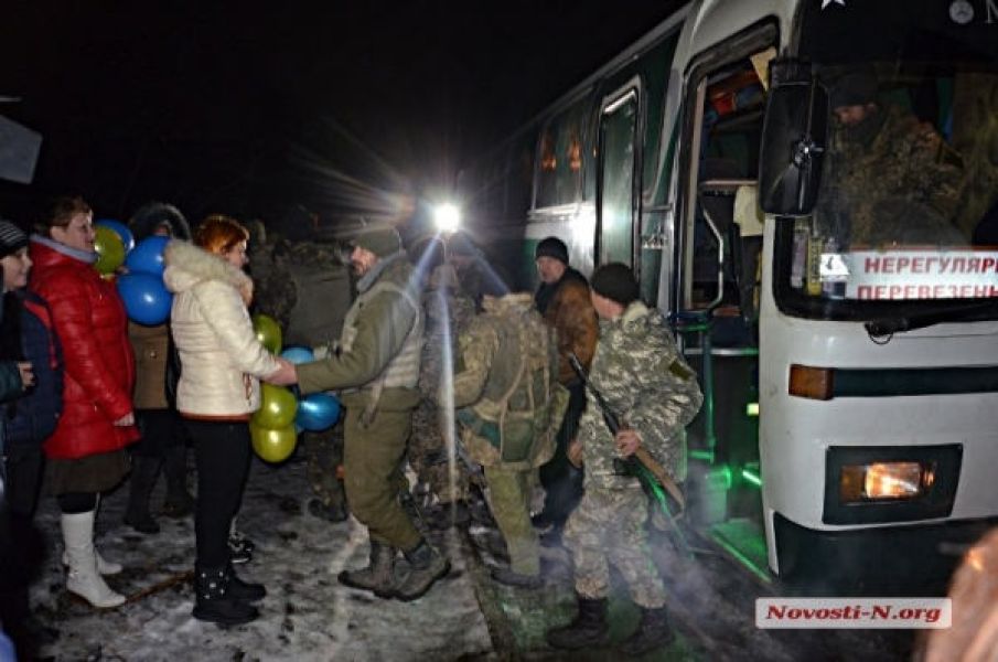 В ночь с 8 на 9 декабря в Николаев после двухмесячного срока службы из зоны проведения антитеррористической операции прибыли бойцы морской пехоты. Около 100 военнослужащих на двух автобусах в полночь заехали на территорию своей части в Соляных.