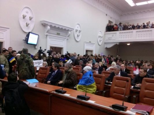 Они выстроились сбоку от здания. Также на митинг приехал нардеп Олег Ляшко, после чего митингующие вошли в сессионный зал.