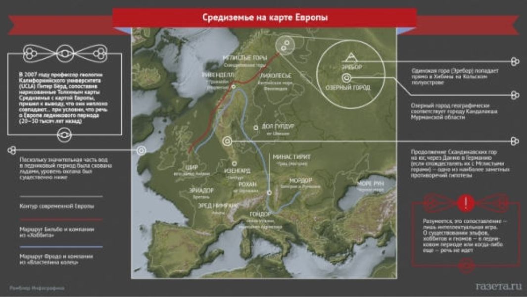 Известно, что и «Хоббита», и другие книги цикла автор писал между двумя войнами, и что через сложный фэнтези-сюжет аллегорически описал геополитические процессы на нашем континенте. Художники студии Rambler Инфографика сопоставили карту Европы и Средиземья, и выяснили, где находятся Ородруин, Одинокая Гора и Шир, из которого в свое путешествие «туда и обратно» однажды вышел Бильбо Бэггинс.
