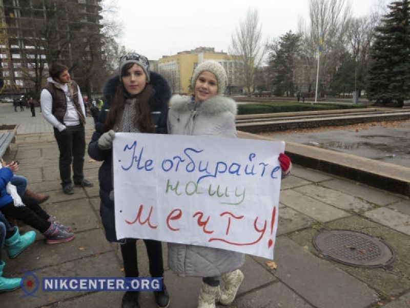 16 декабря около 50-ти юных спортсменов вместе с тренерами пришли под здание Николаевской ОГА с требованием возобновить электроснабжение в СКПБ «Водолей».