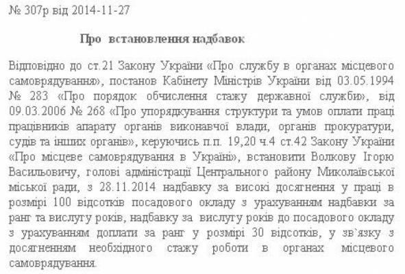 — Установить Волкову Игорю Васильевичу, главе администрации Центрального района Николаевского городского совета, с 28.11.2014 надбавку за высокие достижения в труде в размере 100 процентов должностного оклада с учетом надбавки за ранг и выслугу лет, надбавку за выслугу лет к должностному окладу с учетом доплаты за ранг в размере 30 процентов, в связи с достижением необходимого стажа работы в органах местного самоуправления, — говорится в распоряжении мэра.