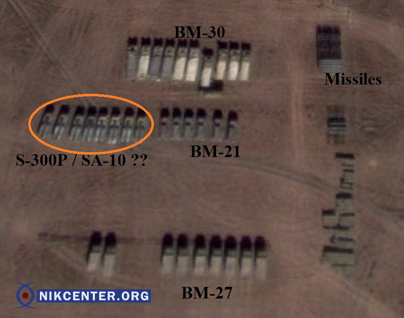 Еще одни снимки со спутника свидетельствуют о том, что россияне накопили на этой базе также зенитные ракетные комплексы среднего радиуса действия. Возможно, речь идет о С-300 (название НАТО — SA-10 Grumble).