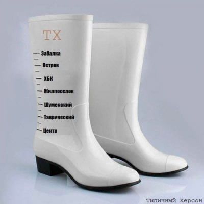 Интернет-издание «Типичный Херсон» опубликовало на своей странице в соцсети картинку с изображение резиновых сапожек специально для Херсона — в делениями, на которых указана глубина луж в разных районах города.