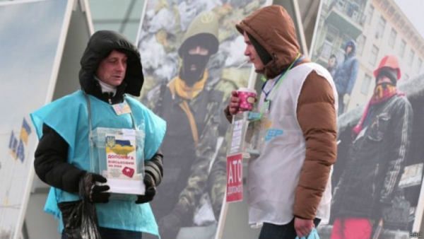 Молодые улыбающиеся люди с прозрачными пластиковыми коробками перед собой просят прохожих бросить несколько гривен на помощь военным или лечение ребенка. На самой коробке — фото ребенка, его печальный диагноз и название благотворительного фонда, который в большинстве случаев не запоминается, вроде "Благотворительная столица", "Лучик милосердия", "Евро Украина" или "Эпоха надежды".