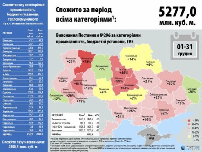 В "Нафтогазе" отметили, что потребители Украины по категориям, установленным постановлением правительства от 09.07.2014 г. №296 (промышленность, ТКЭ, бюджетные учреждения), превысили лимиты использования природного газа на 25,6%. При плане в месяц на уровне 2,4 млрд. куб. м этими категориями было потреблено около 3 млрд. куб. м. Население в прошлом месяце использовало 2,3 млрд. куб. м, что на 12% меньше, чем в декабре 2013 года.