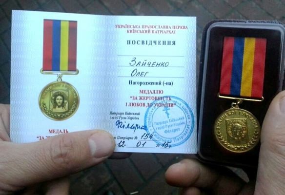 «Получил награду от Патриарха Филарета. Счастлив. Думаю можно подвести некоторые промежуточные итоги. За независимость Украины я воюю с 1988 года. За эти годы, я понял, что самое лучшее, кто есть в Украине — это люди. Поэтому, друзья, без всякого пафоса хочу сказать: служу народу Украины. Слава украинцам!», — написал на своей странице в Facebook Олег Зайченко.