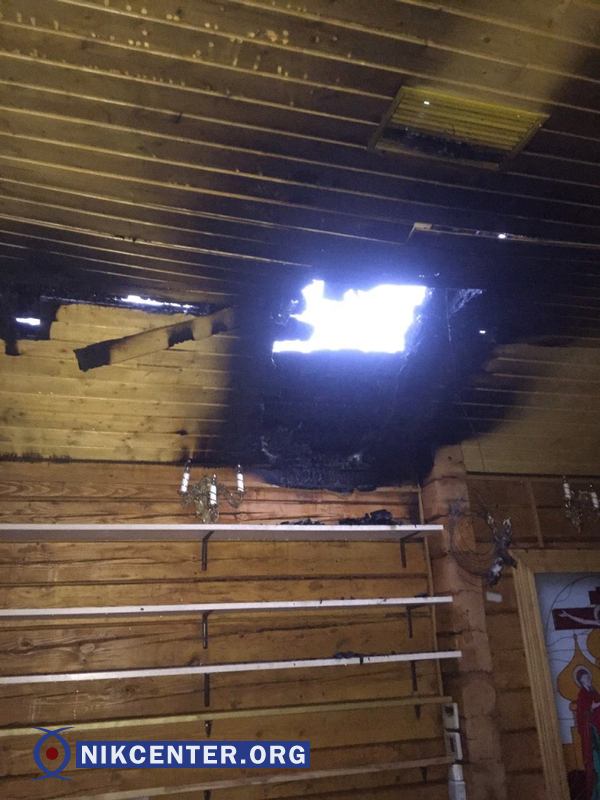 Известно, что злоумышленник поджог колесо от автомобиля и бросил у стены, в результате чего огнем была охвачена крыша. В результате пожара огнем повреждена внешняя стена храма, купол, крест, внутри пострадали иконы, а крыша прогорела почти наполовину. В 3:18 пожар был ликвидирован.