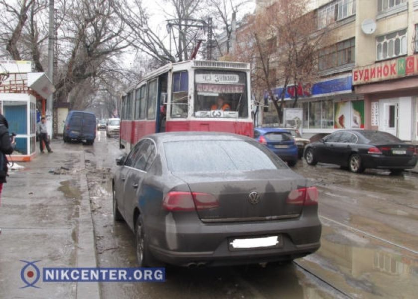 Сегодня, 28 января, в Николаеве в центре города на перекрестке улиц Советской и Потемкинской «Фольксваген Пассат» припарковался на трамвайных путях, остановив его движение.