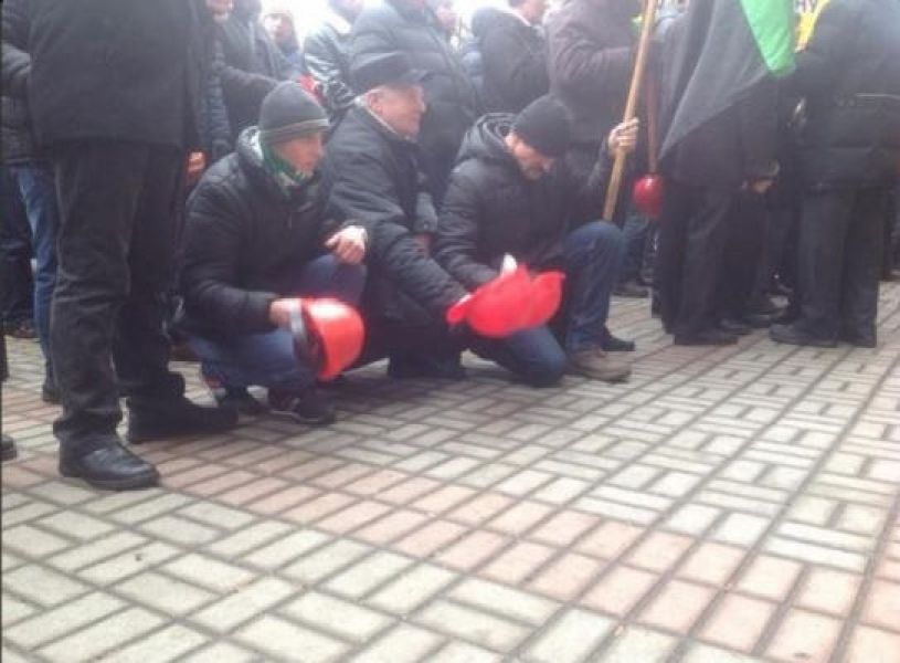 Активисты своими касками бьют по мостовой, но ведут себя мирно. Пока они не выкрикивают никаких лозунгов, однако держат в руках флаги Украины, а также флаги шахтерских профсоюзов.