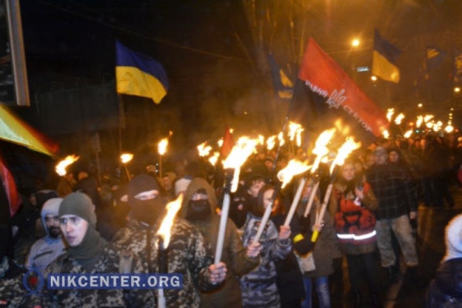 Праворадикалы прошли с горящими факелами по центральной части Херсона, выкрикивая как свои традиционные лозунги, так и содержавшие ненормативную лексику кричалки в которых упоминался президент России.