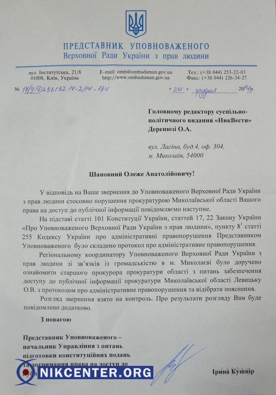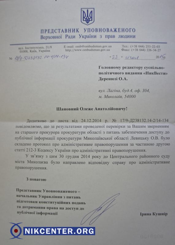 Представитель Уполномоченного по правам человека Верховной Рады Украины, начальник управления по вопросам соблюдения права на доступ к публичной информации Ирина Кушнир составила на старшего прокурора по вопросам доступа к публичной информации Прокуратуры Николаевской области Ольгу Левицкую протокол об административном правонарушении по статье 212-3 КУоАП («Нарушение права на информацию»).
