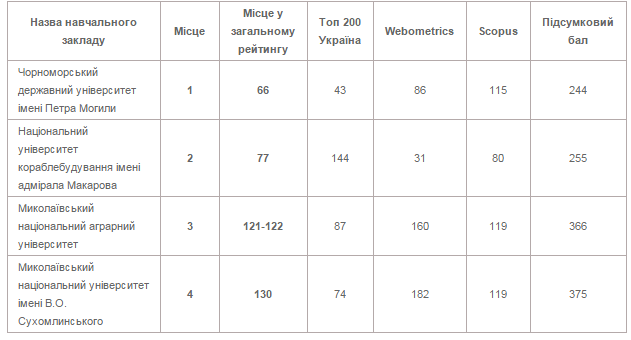 Лучшим вузом в Николаеве стал ЧГУ им.П.Могилы, занявший в общем рейтинге 66-е место. За ним следует НУК им.адмирала Макарова, занявший 77-е место в обще рейтинге. 121-122-е место в общем рейтинге и «бронза» в рейтинге николаевских вузов – у Николаевского национального аграрного университета, а 130-е место в общем рейтинге и 4-е место в рейтинге николаевских вузов – у ННУ им.В.Сухомлинского.