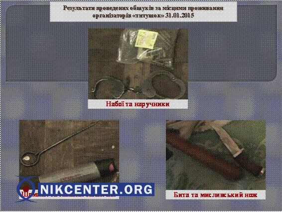 Силовое ведомство также сообщает, что 31 января были задержаны 13 "титушек". Двое – арестовано на основании решения суда, один задержан на основании статьи 208 Уголовного кодекса Украины и ожидает решения суда по определению меры пресечения. Относительно остальных десяти лиц их процессуальный статус будет определяться следствием ГПУ после проведения экспертиз по изъятому оружию, боеприпасам, холодному оружию и иных приспособлений для нанесения телесных повреждений.