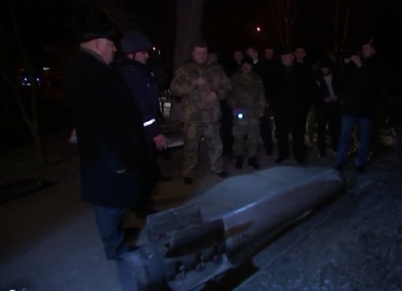 При осмотре разрушенного дома в центре города, в который попал снаряд системы "Смерч", в результате чего пострадали четыре семьи, Президенту были представлены остатки ракет и последствия их разрушительного действия.