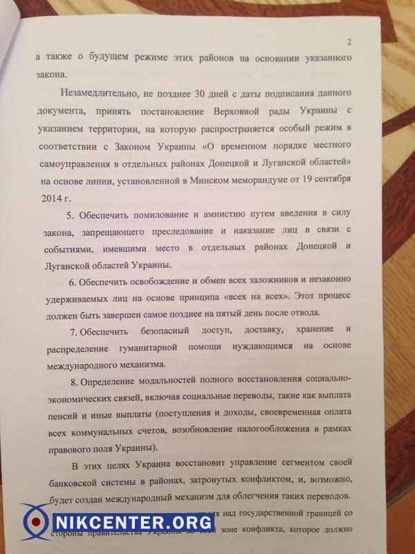 Незамедлительно, не позднее 30 дней с даты подписания данного документа, принять постановление Верховной рады Украины с указанием территории, на которую распространяется особый режим в соответствии с Законом Украины "О временном порядке местного самоуправления в отдельных районах Донецкой и Луганской областей" на основе линии, установленной в Минском меморандуме от 19 сентября 2014 г.
