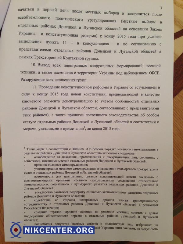 11. Проведение конституционной реформы в Украине со вступлением в силу к концу 2015 года новой конституции, предполагающей в качестве ключевого элемента децентрализацию (с учетом особенностей отдельных районов Донецкой и Луганской областей, согласованных с представителями этих районов), а также принятие постоянного законодательства об особом статусе отдельных районов Донецкой и Луганской областей в соответствии с мерами, указанными в примечании[1], до конца 2015 года. (См. примечание)