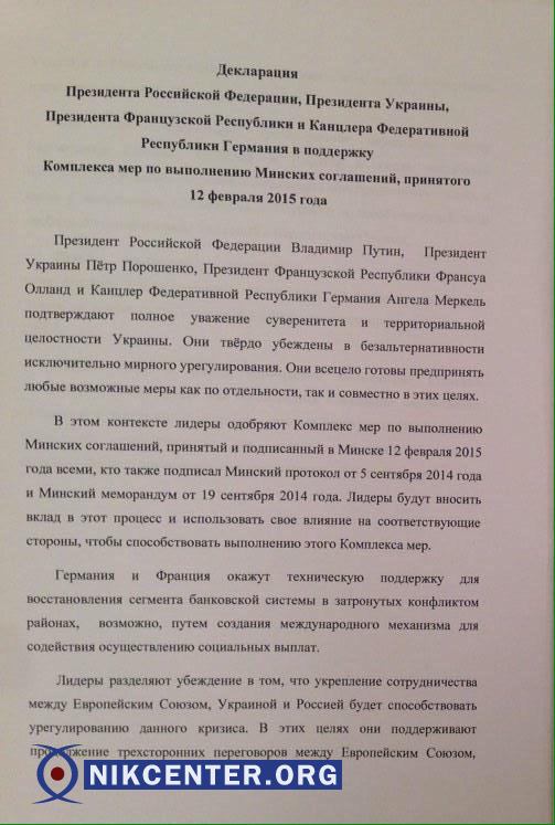 Президенты Франции, Украины, России и канцлер Германии также приняли декларацию о поддержке комплекса мер по выполнению "Минских соглашений".