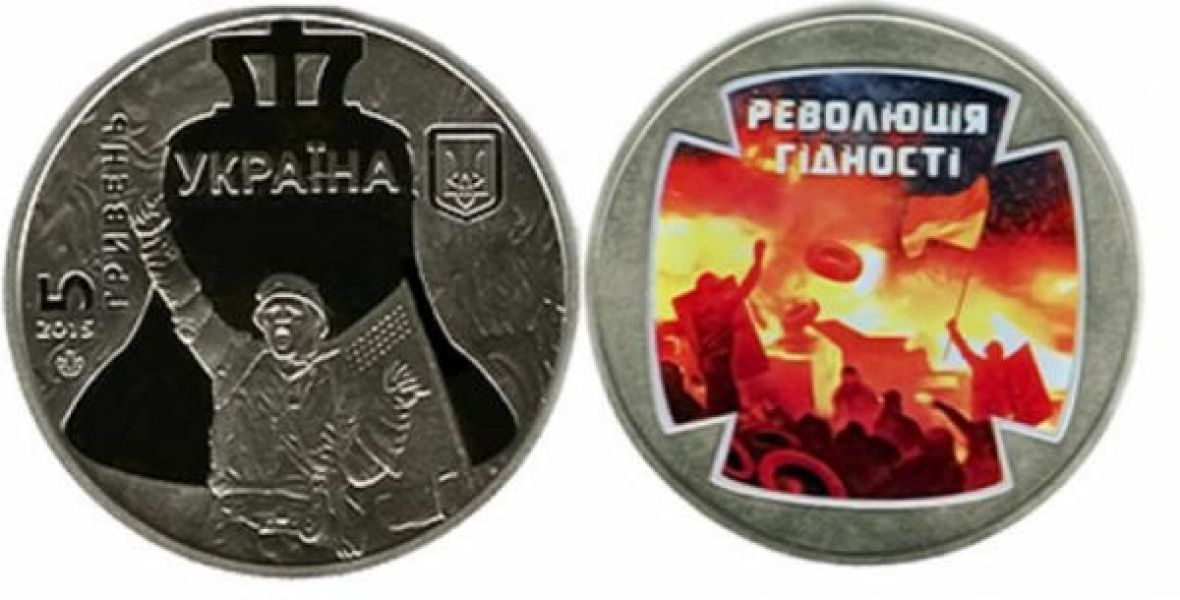 Монета "Революция достоинства" — посвящена гражданскому мужеству и патриотизму, которые продемонстрировали граждане Украины всех национальностей, стремясь развивать и укреплять демократическое государство, конституционные основы демократии, права и свободы человека.