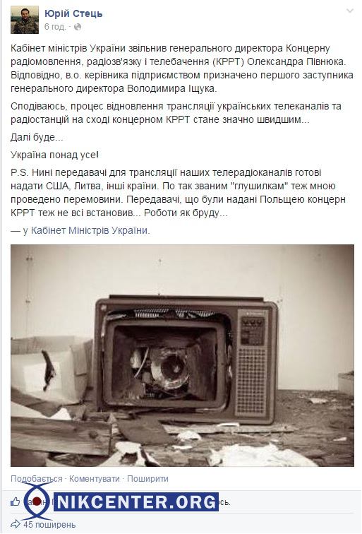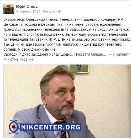 Все началось с того, что Юрий Стець в начале февраля на своей страничке в Facebook обвинил генерального директора концерна Александра Пивнюка практически в госизмене. Он написал, что Пивнюк, а также его подчиненные якобы способствуют распространению телесигнала российских телеканалов и телеканалов самопровозглашенных народных республик на временно оккупированные территории, саботируют распространение украинских каналов.