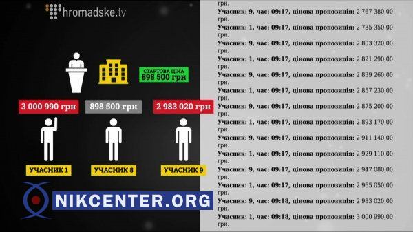 Перед вами — один из протоколов торгов, на которых была разыграна данная схема. В торгах принимают участие трое правильных потенциальных покупателей. На кону трехкомнатная квартира в Днепропетровске. Первым свое предложение в сумме 898 500 грн. делает участник номер 8. После этого он замолкает, а в игру вступают двое его приспешников, номер 1 и номер 9. Через несколько минут эти «боги» аукциона поднимают цену из восьмисот тысяч до трех миллионов гривен. И, казалось бы, теперь последний участник, предложивший наивысшую цену, должен выиграть аукцион и радоваться новому приобретению. Однако этого не происходит. По странному стечению обстоятельств, после объявления участника номер 1 победителем, он почему-то резко передумывает и отказывается от приобретения. Более того, участник номер 9 также по неизвестным причинам решает отказаться от всех своих предложений. В итоге побеждает участник номер 8 — то, что дал первое предложение, самое низкое. Так квартиру продают по минимальной цене нужному человеку.