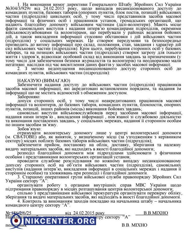 "24 февраля командование Вооруженных сил Украины на выполнение директивы Генерального штаба приказало ограничить допуск посторонних лиц, в том числе аккредитованных работников СМИ и волонтеров, к позициям и объектам военных. Также командование запретило "самовольные" выступления военнослужащих перед СМИ и предоставления ими интервью", — говорится в сообщении.