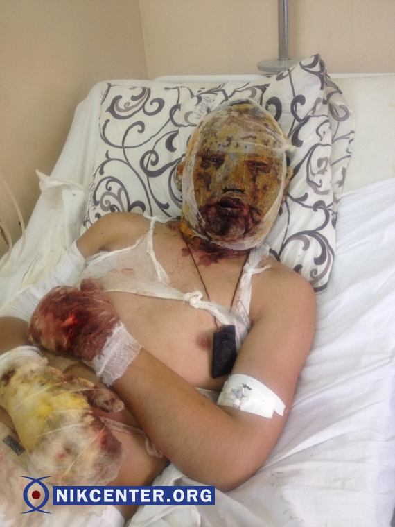 Лицо сожжено, обмотано бинтом, из-под бинта выступает кровь. Кисти рук тоже замотаны. Уши обгорели и съежились.