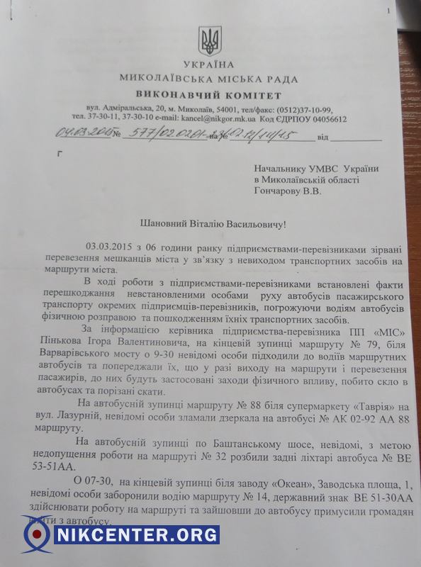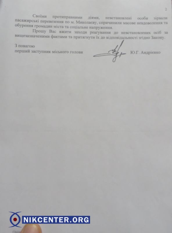 — Не будем внедряться в причину того, что произошло вчера, я подписал заявление на областное управление внутренних дел, на прокуратуру и СБУ. Я высказал там свое мнение и некоторые примеры того, что нам передали перевозчики: об угрозах и о специфическом отношении к тем людям, которые готовы были выйти на маршрут, поэтому я думаю, что здесь правоохранительные органы должны дать свою соответствующую оценку, — сообщил Андриенко.