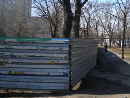 Когда-то напротив материальных ворот ГП «Зоря»- «Машпроект», на углу Октябрьского проспекта и переулка Шуры Кобера, располагалась зеленая зона, сегодня на ее месте – лишь высокий забор, за которым скрывается строительная площадка.