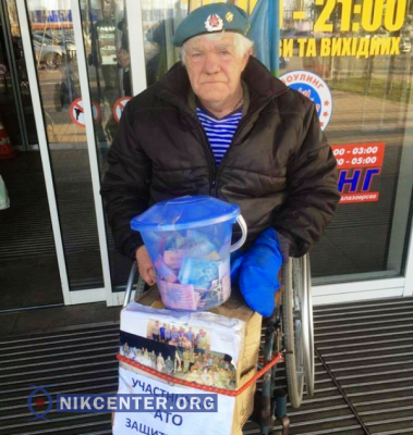 67-летний инвалид-колясочник, бывший военнослужащий-десантник, начиная с апреля 2013 года, собирает пожертвования для военнослужащих, находящихся в зоне АТО, охраняющих южные границы Украины, и для военных, находящихся на лечении в госпиталях.