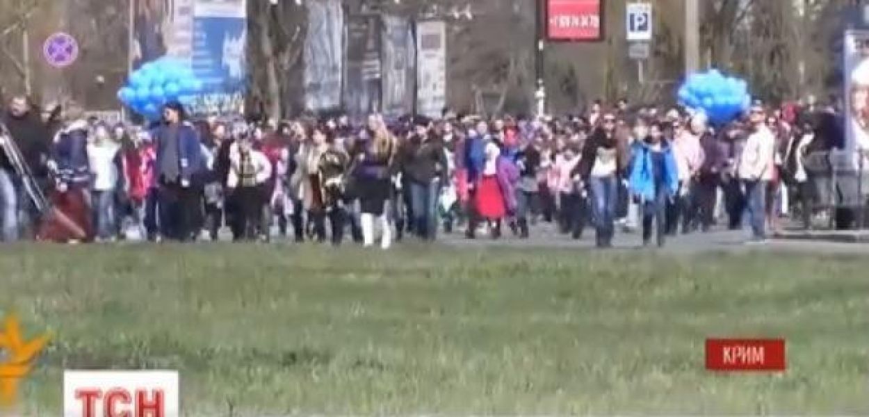 Возглавляла колонну так называемая "министр образования" Крыма. Центр Симферополя перекрыли, площадь Ленина окружили "самообороновцы" и полицейские.