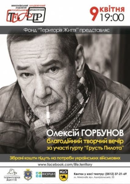 9 апреля в 19:00 в Николаевском академическом художественном русском драматическом театре (ул. Адмиральская, 25) Фонд «Территория Жизни» при поддержке Николаевской облгосадминистрации представляет благотворительный творческий вечер легендарного актера театра и кино Алексея Горбунова и его группы «Грусть Пилота».