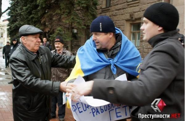 Кроме этого, к мэрии также пришли проукраинские активисты — по их словам, чтобы пресечь любые антиукраинские лозунги. В частности, во время выступления первого секретаря областной ячейки КПУ Владимира Матвеева активист Евромайдана, бывший «свободовец» Игорь Деревянко начал его перебивать криками «Ганьба» и достал плакат «Россия — агрессор».