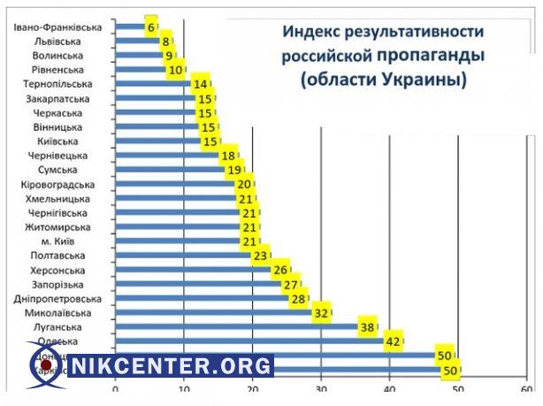 Согласно результатам соцопроса, среднее значение индекса результативности российской пропаганды (РРП) по Украине равняется 26.