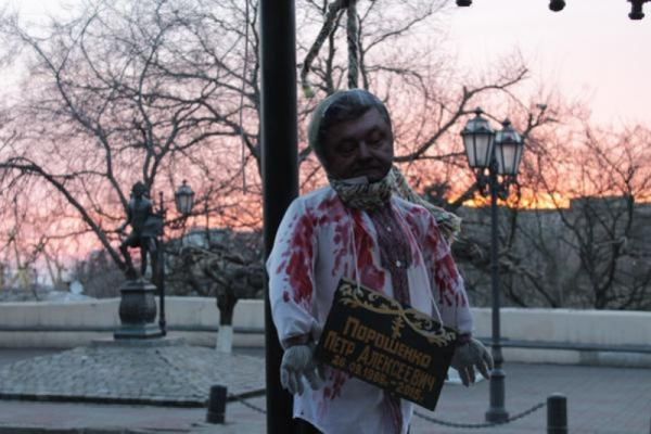 В ночь на 1 апреля неизвестные на улице Дерибасовской повесили чучело Петра Порошенко в окровавленной вышиванке.