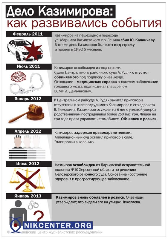 Примерно спустя час сотрудники ГАИ нашли машину в одном из дворов дома по ул. Чайковского. Водителем, сбившим молодую девушку, оказался 22-х летний Алексей Казимиров. По состоянию здоровья Казимирова отпустили на подписку о невыезде. Приговором Центрального районного суда Николаева от 26.01.2012 Казимиров признан виновным, ему было определено наказание в виде лишения свободы сроком на 6 лет.