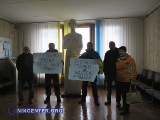 Активисты вооружились плакатами: «Спасательная станция — не равно имению феодала», «Антощенко, верни берег Южного Буга общине».