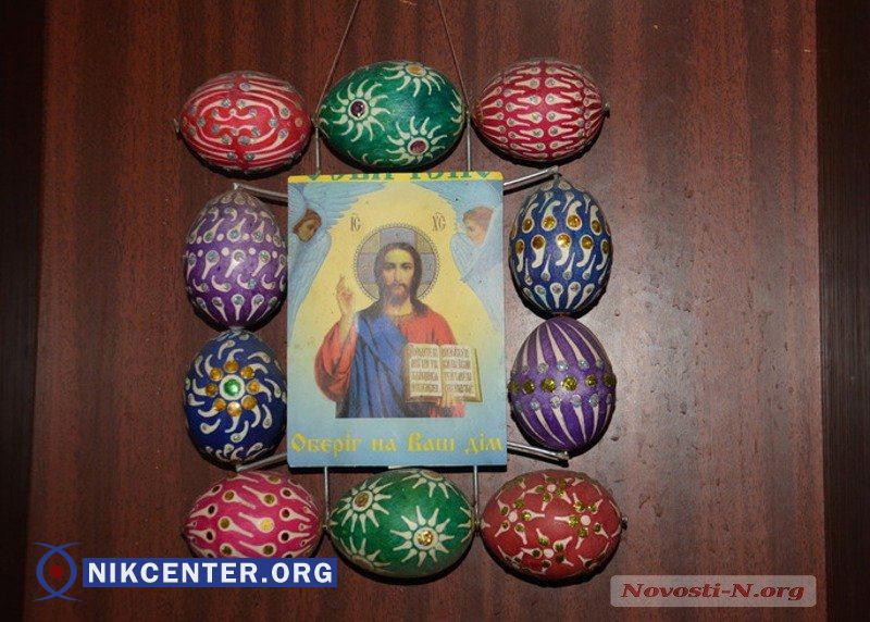 Так появилась одна писанка, затем вторая, третья, десятая. Возникла идея скрепить их воедино. Сделать это, учитывая что яичная скорлупа хрупкая, дело нелегкое. Но пенсионер повозился и нашел выход: при помощи пайеток укрепил отверстия, через которые выдувал содержимое яйца, и связал между собой уже готовые писанки леской. Так постепенно, шаг за шагом, мужчина создавал свой ковер, сплетая между собой бусы из расписанных яиц.