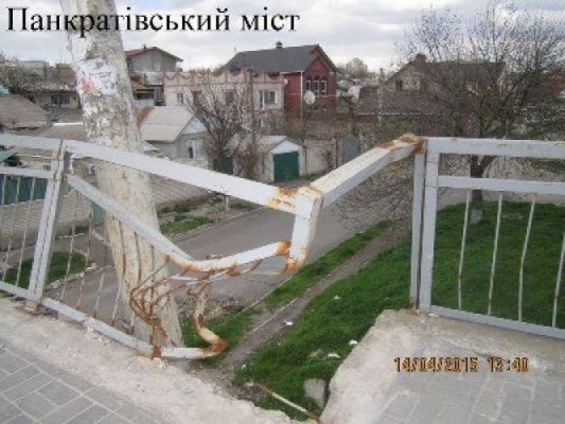 — На Панкратовском мосту отсутствует часть металлической ограды, что является угрозой жизни жителей. Начальник управления транспортной, дорожной инфраструктуры и связи департамента жилищно-коммунального хозяйства городского совета — Вербицкая А.А. осведомлена о сложившейся ситуации.
