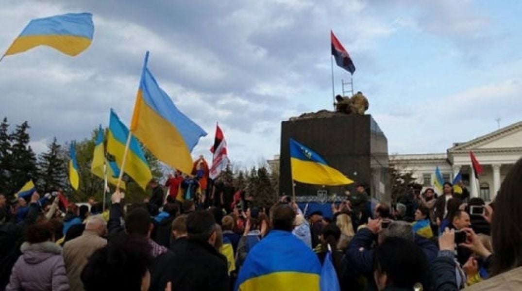 Свержение памятника состоялось за несколько минут. На центральной площади собралось около тысячи человек по случаю годовщины последнего проведенного проукраинского митинга в городе в прошлом году.
