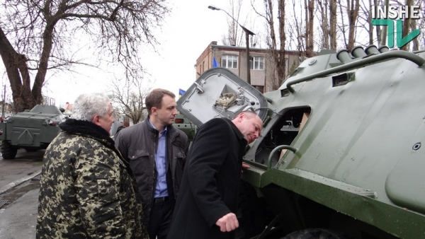 Перед этим, 3 апреля, на территории бронетанкового завода десантникам торжественно передали 10 БТР-80 и 2 БТР-70. С этими машинами ситуация произошла просто анекдотическая: только выйдя на марш, на ул. Садовой, возле памятника Небесной Сотне, головная машина вдруг заглохла и ее пришлось буксировать, чтобы дать возможность проехать всей колонне БТР-ов. Об этом написали журналисты сайта «Інше. ТВ»: Николаевским десантникам 79-ки передали 12 БТР-ов после капремонта.