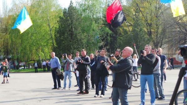 В Славянске проходит традиционная воскресная встреча местных проукраинских активистов на центральной площади города. На этой же площади находится памятник Ленину.