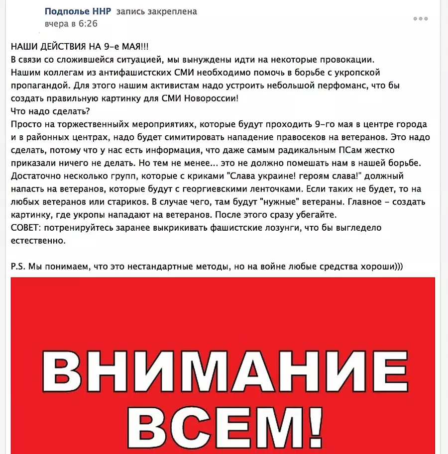 "Что надо сделать? Просто на торжественныйх мероприятиях, которые будут проходить 9-го мая в центре города и в районных центрах, надо будет симитировать нападение правосеков на ветеранов. Это надо сделать, потому что у нас есть информация, что даже самым радикальным ПСам жестко приказали ничего не делать. Но тем не менее… это не должно помешать нам в нашей борьбе. Достаточно несколько групп, которые с криками "Слава украине! героям слава!" должный напасть на ветеранов, которые будут с георгиевскими ленточками. Если таких не будет, то на любых ветеранов или стариков. В случае чего, там будут "нужные" ветераны. Главное — создать картинку, где укропы нападают на ветеранов. После этого сразу убегайте. СОВЕТ: потренируйтесь заранее выкрикивать фашистские лозунги, что бы выгледело естественно. P.S. Мы понимаем, что это нестандартные методы, но на войне любые средства хороши", — призывают сепаратисты.