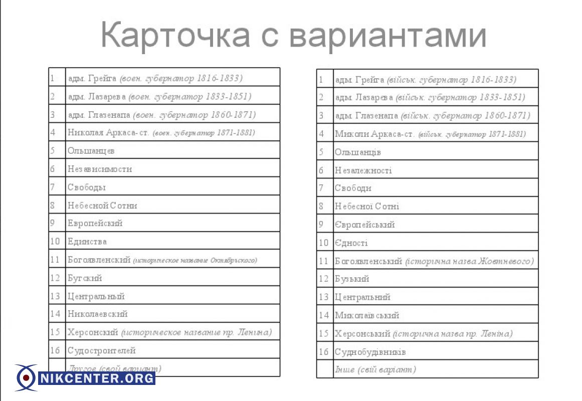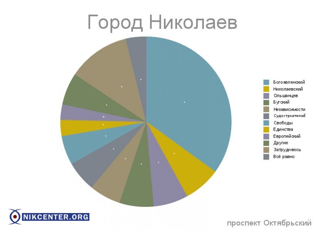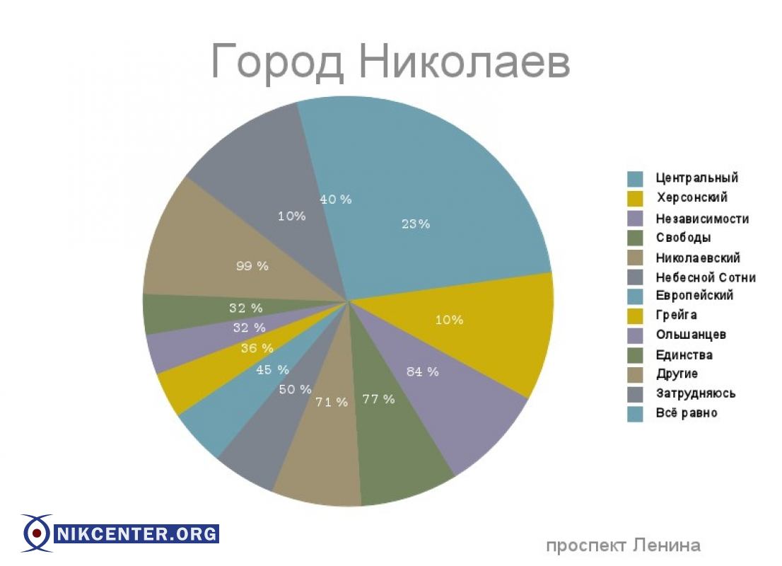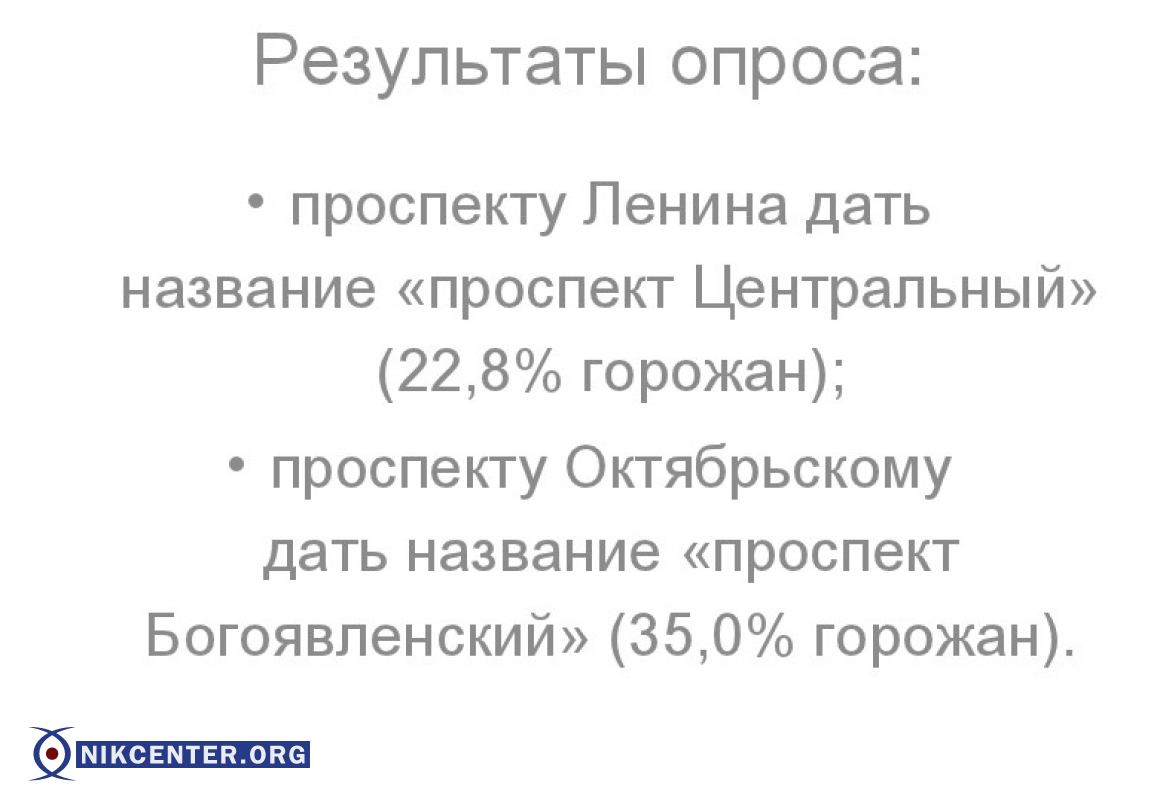 Среди 1000 опрошенных респондентов большинство (а это 22,8 % николаевцев) проголосовали за то, чтобы нынешний проспект Ленина назывался Центральным, а проспект Октябрьский горожане желают называть Богоявленским. За такое наименование проголосовало 35 % опрошенных.