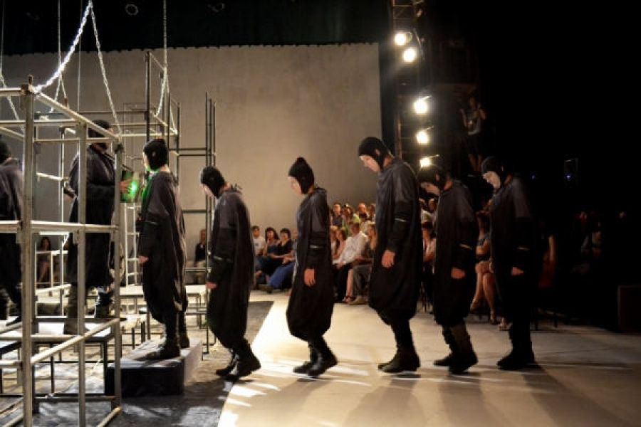 Художники Наталья и Сергей Рыдванецкие создали на сцене мрачный, холодный, крайне формализованный мир: металлические конструкции, клетки на цепях, актеры – в одинаковой мешковатой одежде с капюшонами, выбеленные лица, одинаковая угловатая пластика.