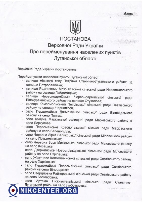 "В мае экспертная комиссия провела исследовательскую работу и пришла к выводам, которые изложила в проекте постановления Верховной Рады Украины о переименовании населенных пунктов Луганской области. Согласно проекту, всего на контролируемой Украиной территории области следует переименовать 19 населенных пунктов, названных в честь деятелей коммунистического режима", — сообщает пресс-служба.
