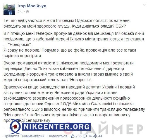 Мосийчук заявил, что обратился к Михаилу Саакашвили и главе УСБУ в Одесской области, потребовав прекратить пускать в эфир «Новороссию» и наказать виновных.